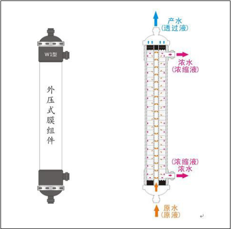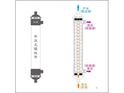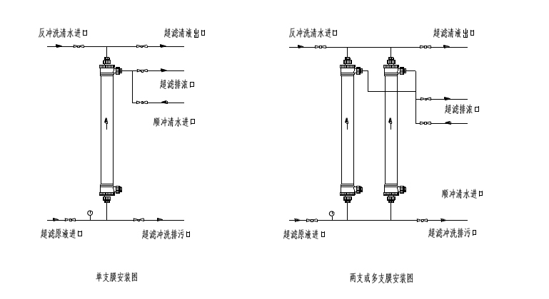 工作原理:本品為外壓式超濾膜組件,根據(jù)膜組件外壁的箭頭方向,箭頭指向的端口是超濾透過液出口, 下端是原液進(jìn)口,側(cè)面兩個端口是排濃(回流)口;或者根據(jù)超濾膜接口上面的標(biāo)簽,分別貼有“進(jìn)水口”、“出水口”“排污口”的標(biāo)識。 超濾正沖洗:定義為從上排濃(回流)口,向下沖洗的方法。一般清水沖刷即可清除膜組件內(nèi)殘留的濃縮液。超濾反沖洗:定義為從超濾出水口,向下沖洗的方法。反沖洗水是從膜的中空孔內(nèi)向外沖刷,可有效恢復(fù)膜的透過能力,但是沖洗液必須是純水或超濾液;本品在安裝使用時,建議豎立安裝,進(jìn)水口在下端,出水口在頂端, 回流口在側(cè)面。
